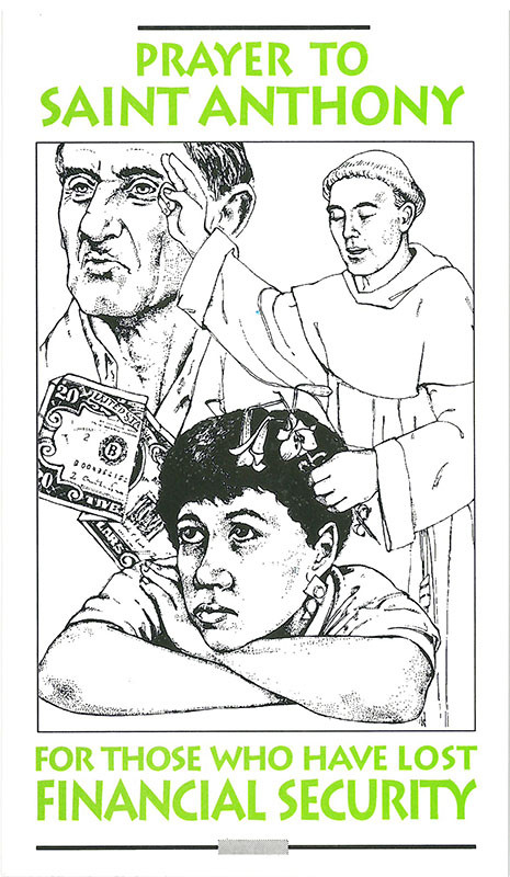 A prayer card featuring a novena prayer to St. Anthony for those who have lost financial security. The card also recounts how St. Anthony in his life as a friar defended those who were destitute and helped them to find sustenance and the means to earn a livelihood.